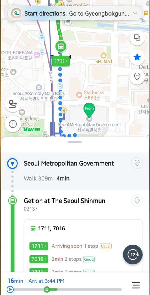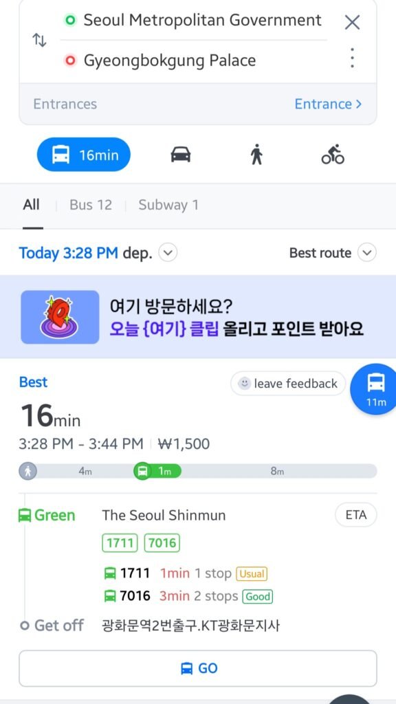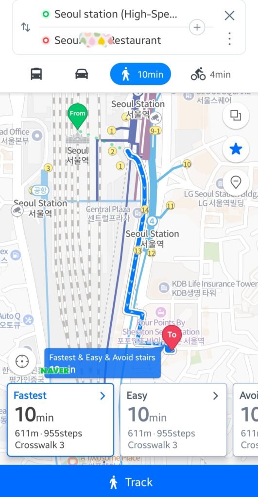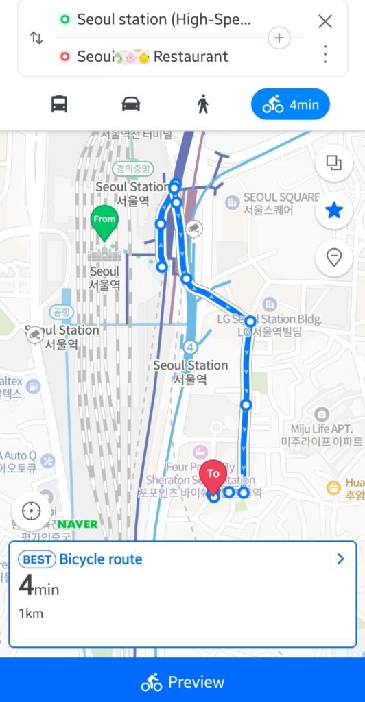 One surprise for many first-time visitors to Korea is that Google Maps doesn’t fully function here. While it works for location search and viewing places, it doesn’t offer walking or driving navigation.
